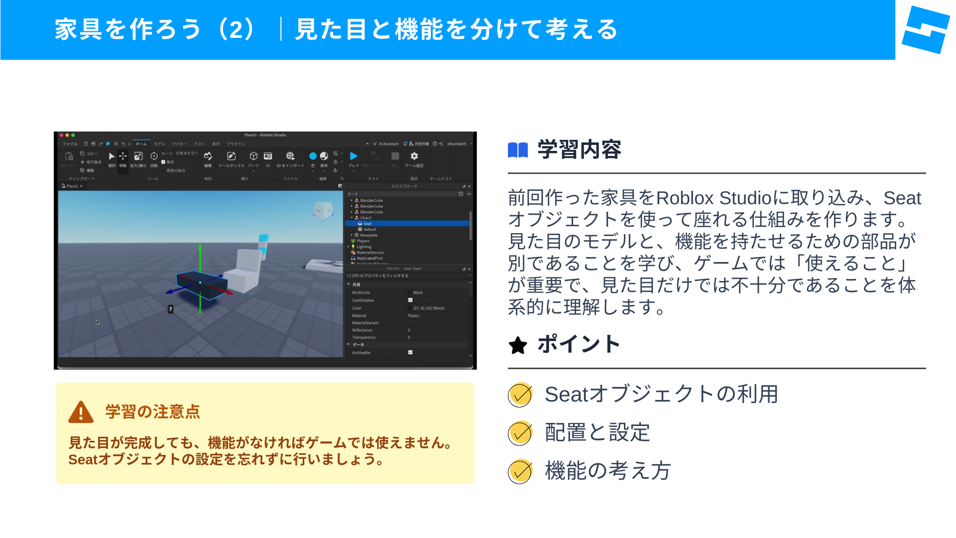 Roblox入門:24コマ Roblox中級:24コマ(製作済み。提携教室所属で受講可能) Roblox上級:24コマ(企画設計中) |